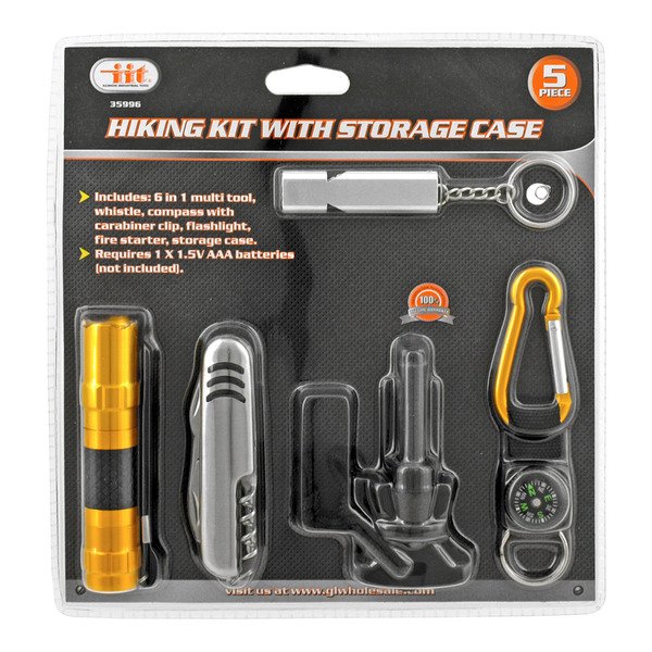 Product Summary Packing the "Ten Essentials" whenever you step into the backcountry, even on day hikes, is a good habit. Hikers should always be prepared for a wide range of temperatures and weather conditions while hiking. Temperatures in the mountains typically fluctuate as weather patterns change. If your hike involves a major change in elevation, you should reasonably expect a change in temperature of 10 degrees or more. If not properly prepared, a sudden storm could result in a great deal of discomfort for you. Features Packaging Length: 8.63" Packaging: Blister Pack Includes 6 in 1 Multi Tool Whistle Compass with Carabiner Clip Flashlight Fire Starter Storage Case Flashlight requires (1) AAA battery - Not Included